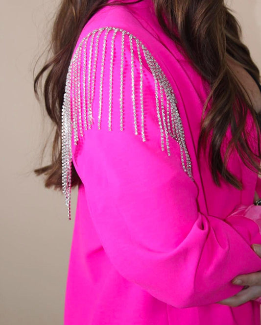 Ultra Pink Rhinestone Fringe Shoulder Open Front Blazer