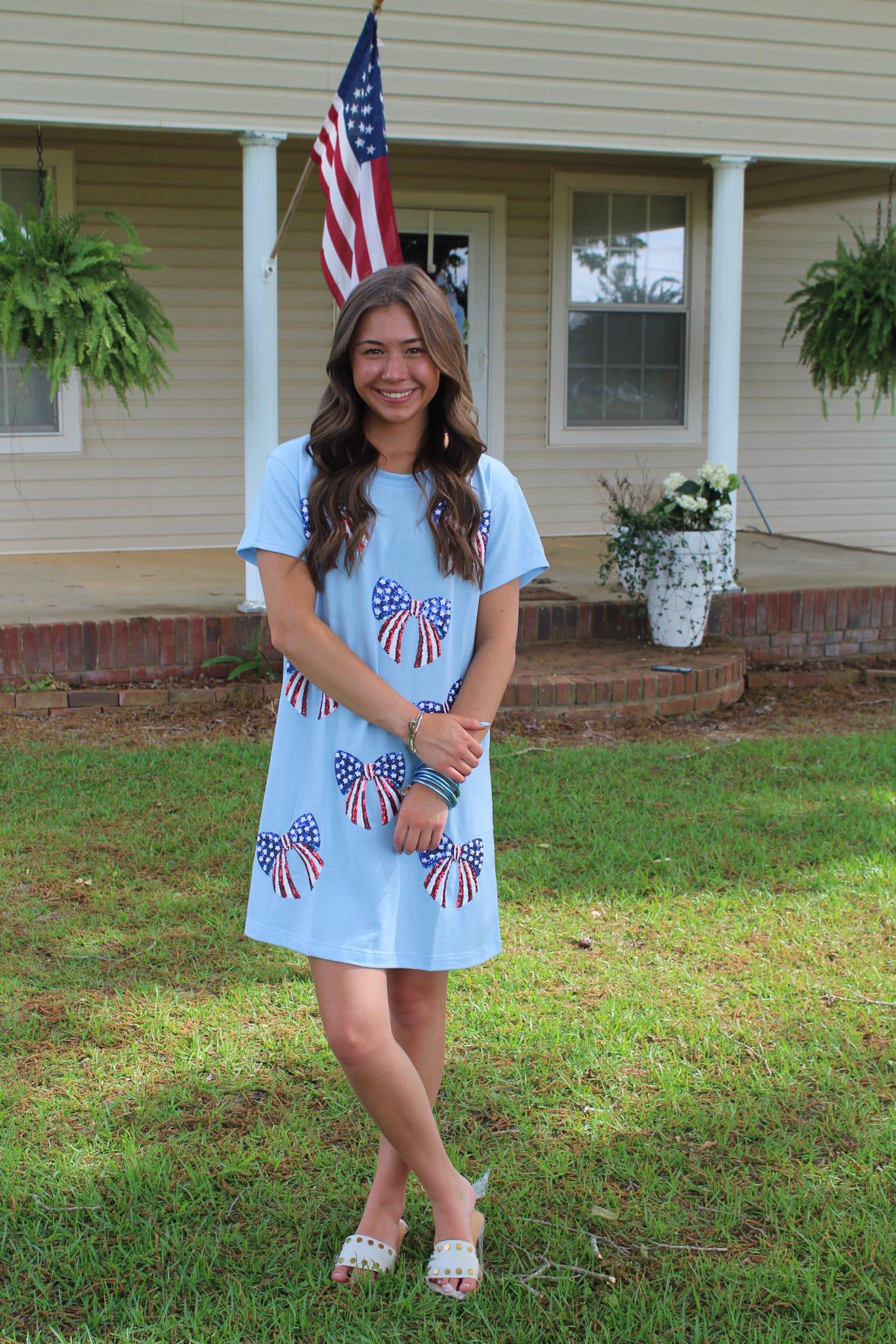 This dress is the perfect blend of playful and patriotic, featuring charming bows and a flattering fit. Show off your American pride while looking effortlessly stylish. (Warning: may cause a sudden urge to sing the national anthem!)