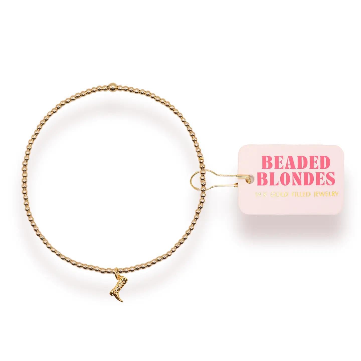 2MM gold beaded stretch bracelet with gold Boot charm. Made from 14 k gold filled beads so perfect for everyday wear! Sweat proof, water proof and tarnish free! Handstrung with love in College Station, Texas.