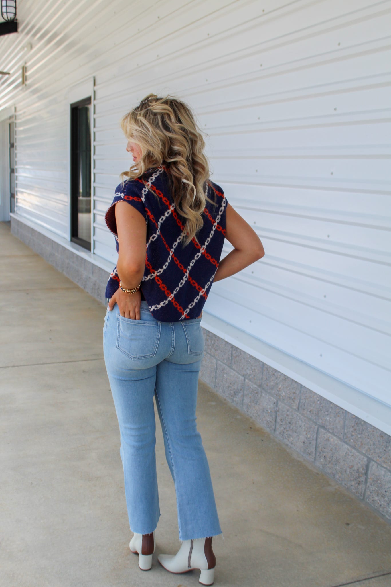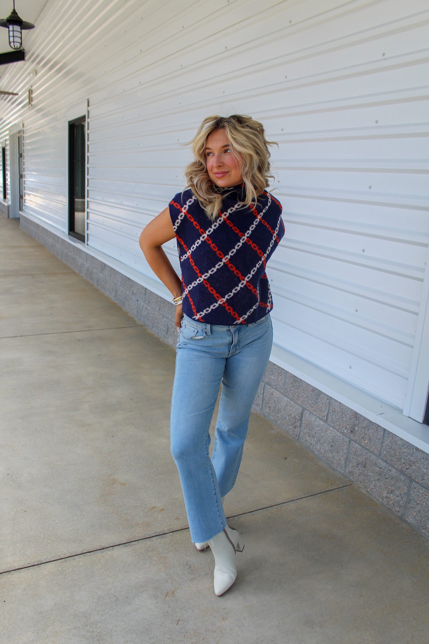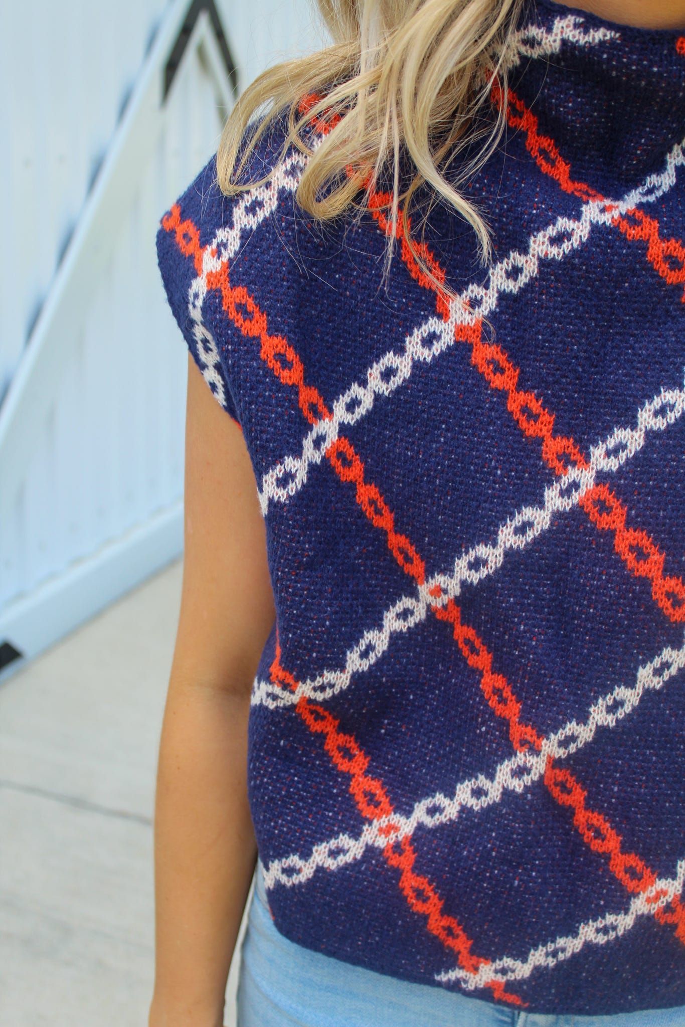 Upgrade your wardrobe with our Frankie Sleeveless Chain Print Knit Top! This playful and quirky top features a unique chain print design, perfect for adding a touch of fun to any outfit. Made from soft and comfortable knit fabric, this sleeveless top is a must-have for any fashion-forward individual looking to make a statement.