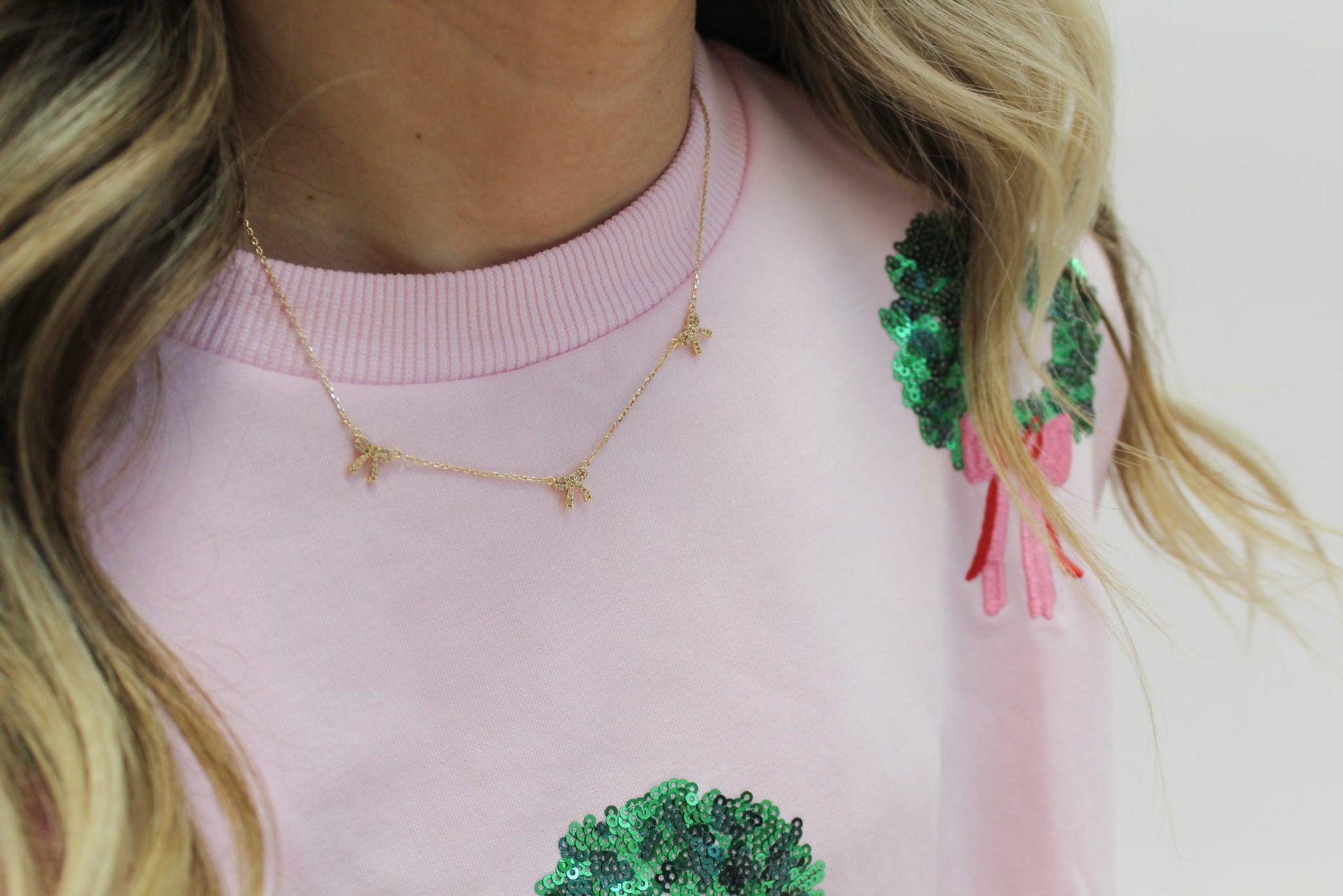 Get festive with our Holiday Bow Necklace! This playful, yet stylish necklace is the perfect accessory for the holiday season. Whether you're dressing up for a party or looking for a subtle touch of holiday spirit, this necklace is sure to make a statement, regardless which color you prefer- bows on the necklace come in red, gold, clear or pink.