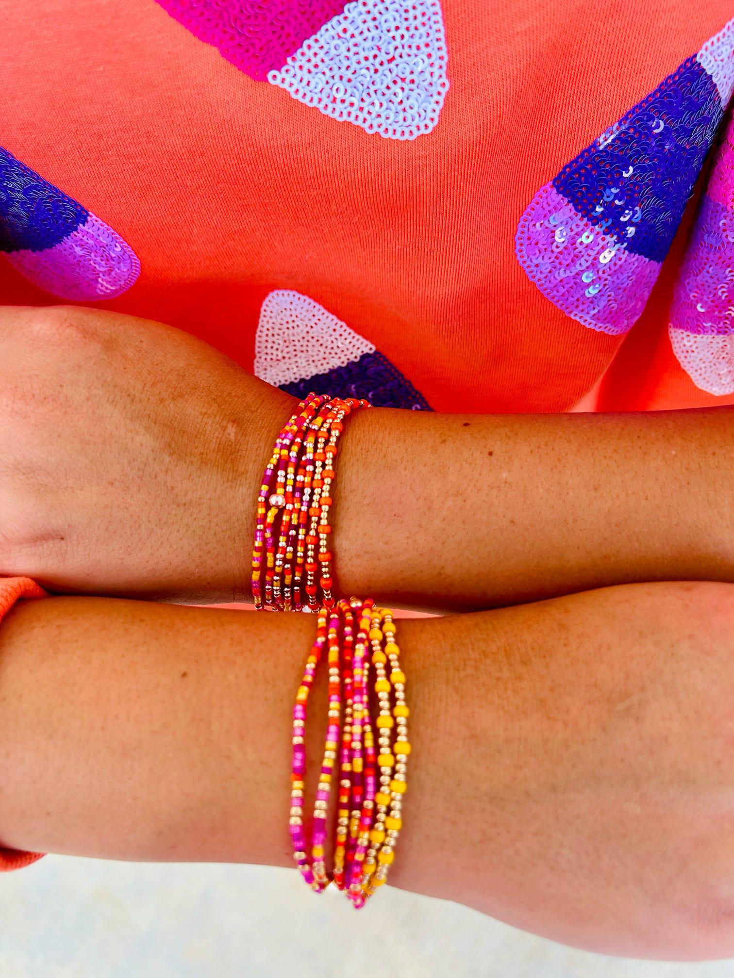 - Hand beaded on high performance elastic for a slight stretch to easily roll on and off your wrist