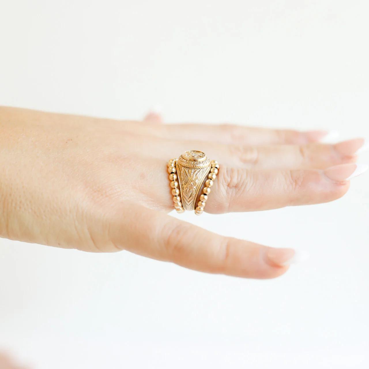 Our dainty gold filled Beaded Bands™ are an elastic ring perfect to wear alone or to be stacked with your class ring or other statement rings. We suggest getting the same size as your ring.