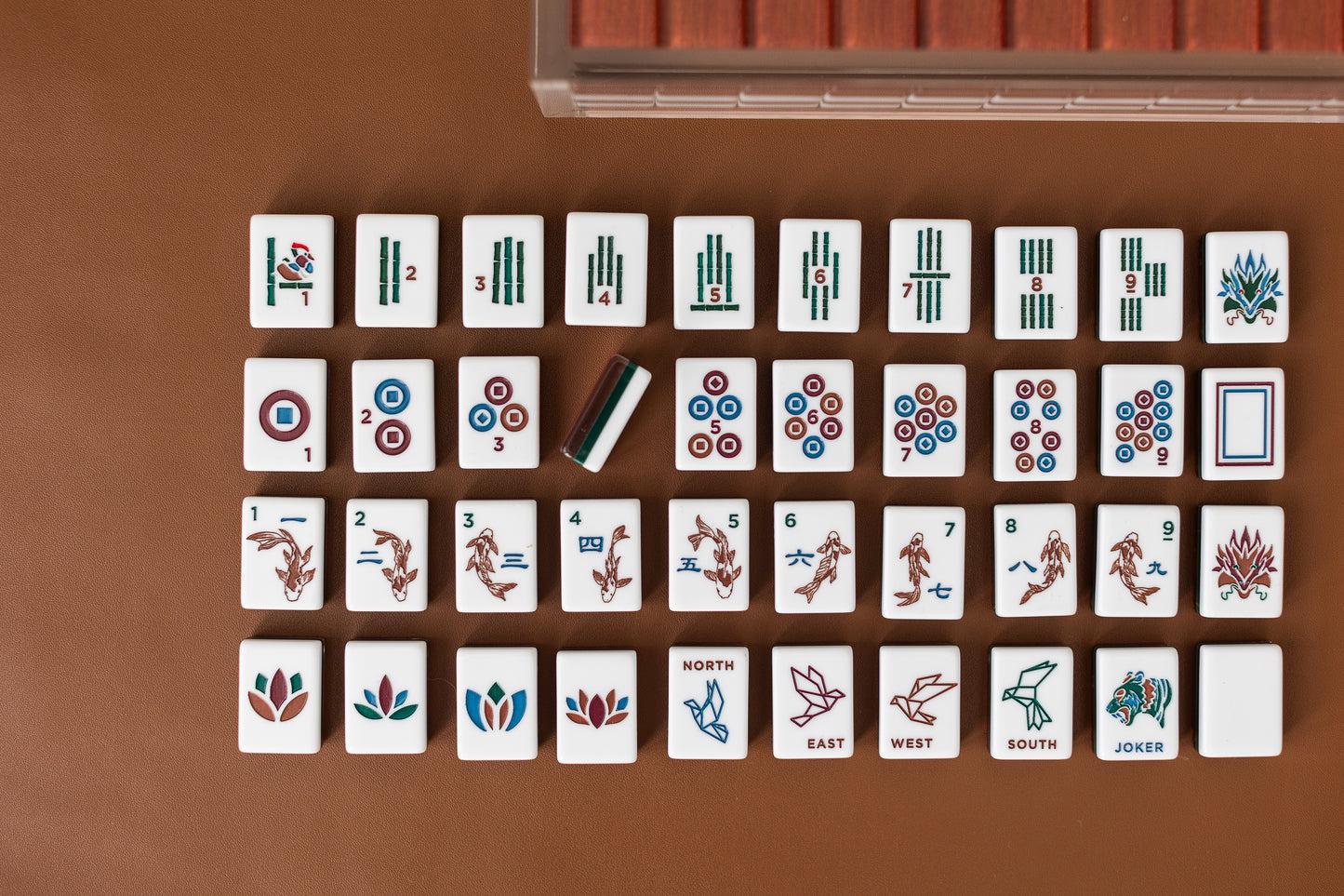 The tile set comes with your choice of a custom sized lucite display box that is just the right size for this beautiful set OR a two tone color-block velvet tile bag. Each tile set comes with two dice and a tile guide that shows all of the tile designs on one side and some things to remember about the game of mahjong on the other side, just in case you need a quick refresh.