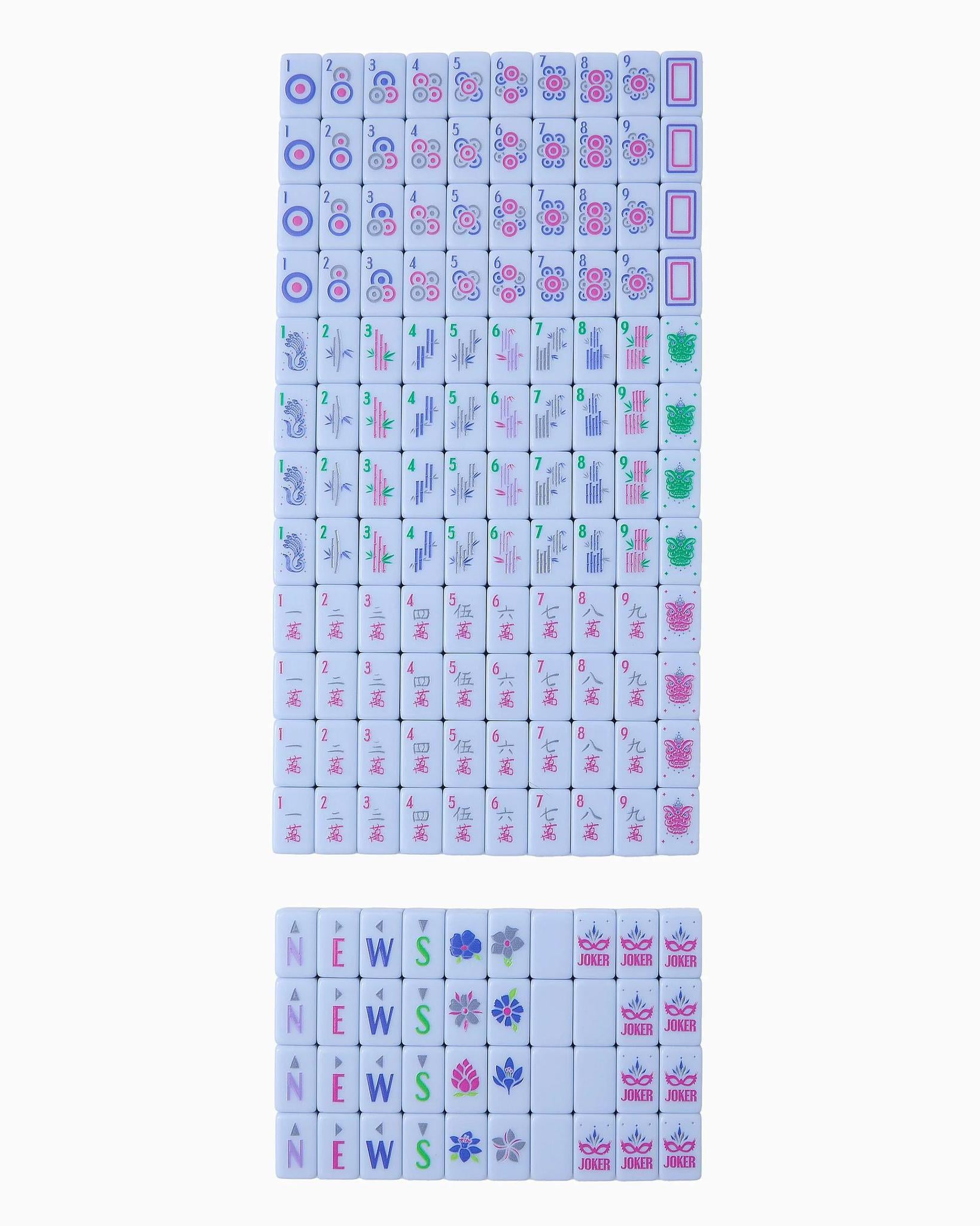 The set includes 160 Mahjong Tiles, 4 White Wooden Racks, Mahjong Mat, Tile Tote and Travel Bag that carries everything.