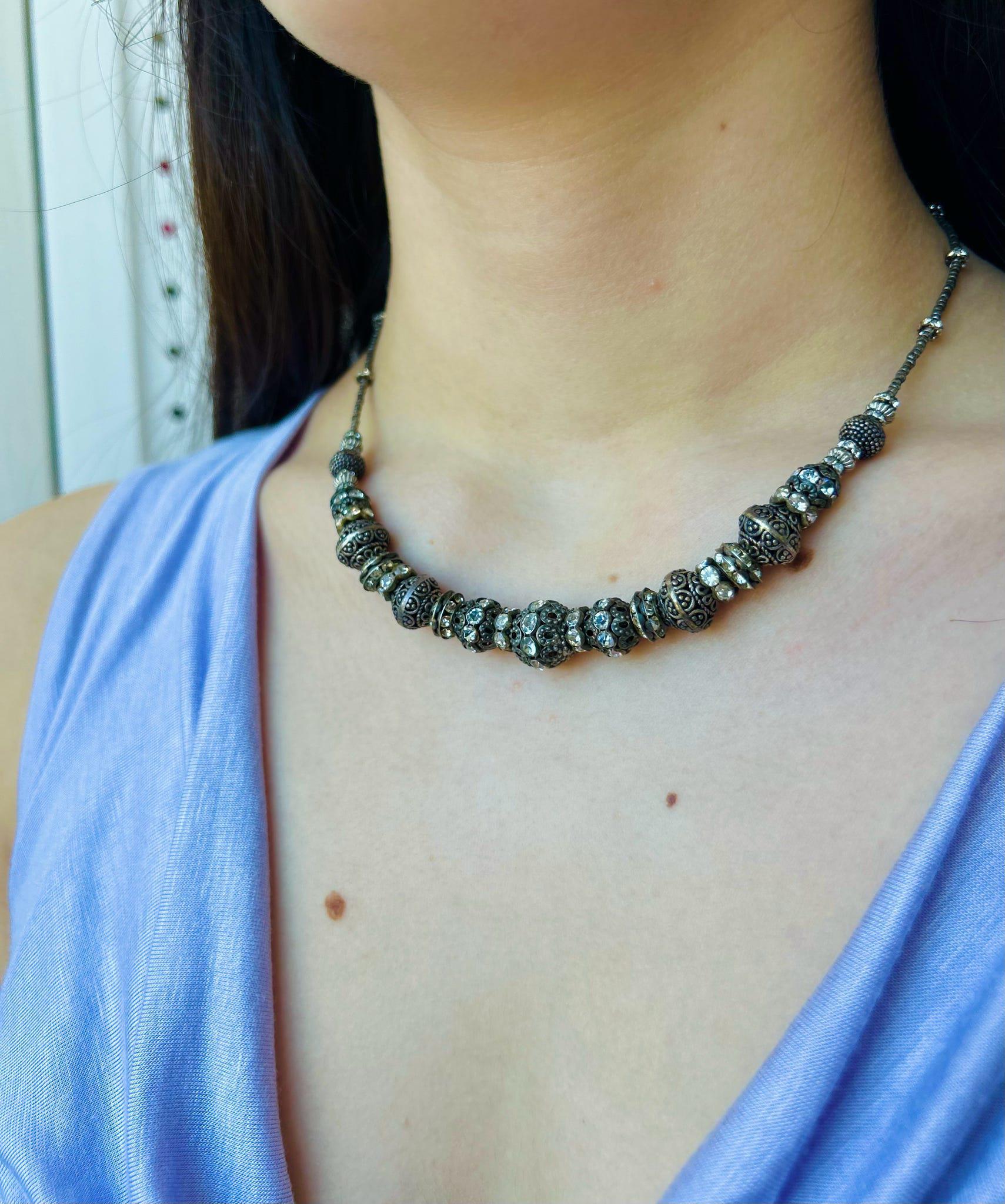 This delicate Rhinestone Bead Heishi Necklace adds a touch of elegance to any outfit. Its sparkling beads are handcrafted for a unique look that will catch eyes. Feel confident and beautiful wearing this stunning accessory.