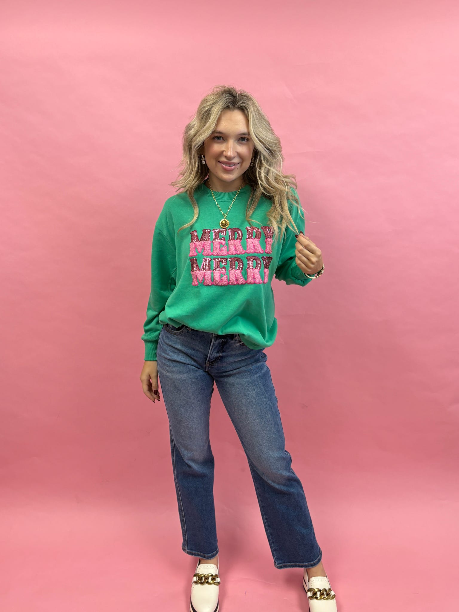 Stay cozy and festive with the Sarah Merry Merry Sweatshirt. Perfect for any holiday event or lazy day at home, this sweatshirt keeps you warm and stylish with its soft material and playful design. 'Tis the season to be comfy!